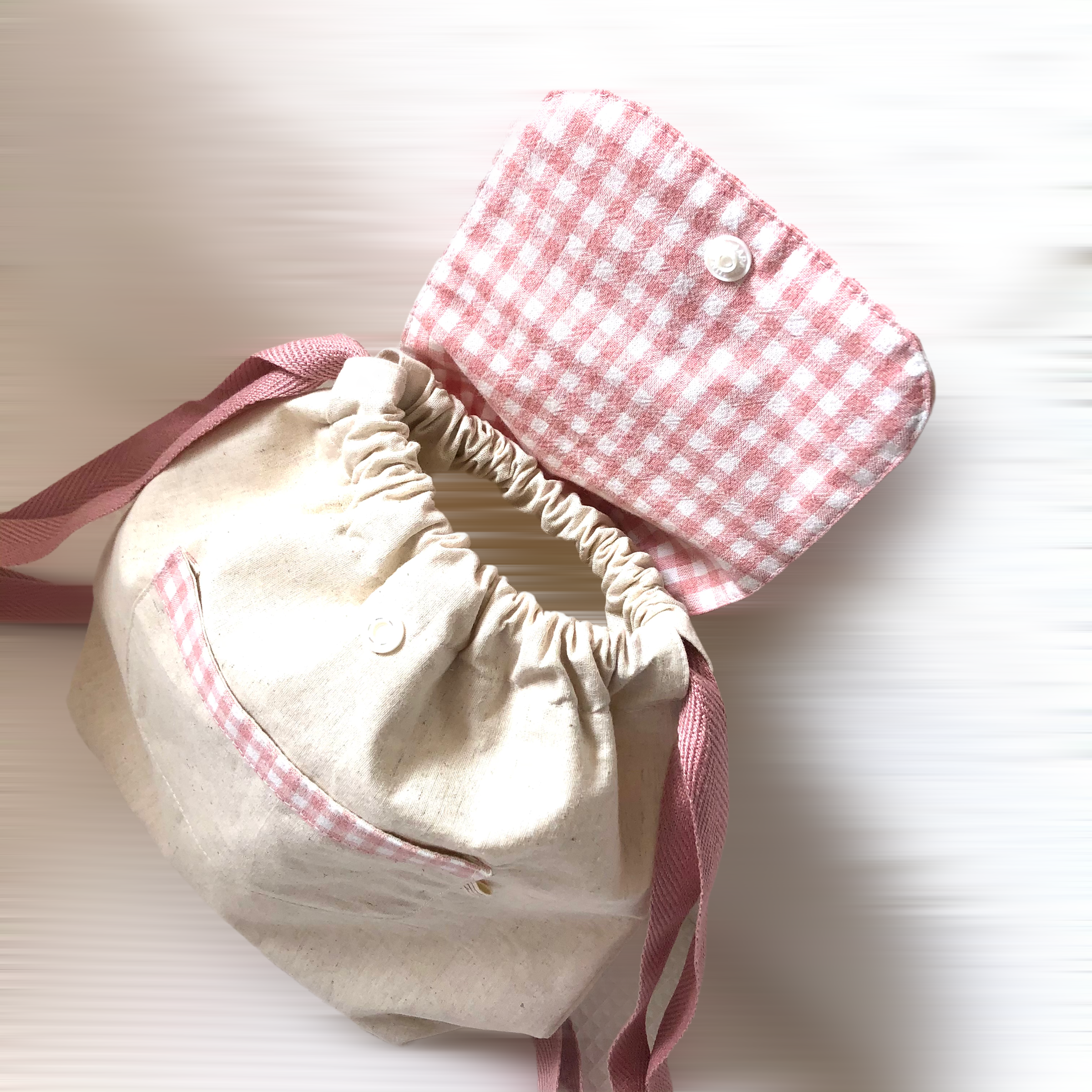 ハンドメイドで作られた、手作り感たっぷりのデザインが魅力的。パステルカラーのチェック柄に人気があります。紐の長さはお子様の成長に合わせて調整できます。